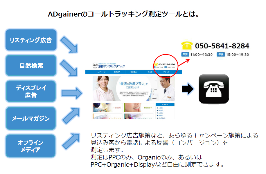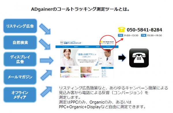 サイバーシーン社は、アドゲイナー社(本社:米国)と業務提携を結び、アドゲイナー社が提供するコールトラッキングシステムを成果報酬型WEB集客代行サービスに2014年1月15日より採用しました。成果報酬型WEB集客代行サービスに導入するため、費用はサイバーシーン社が負担し、成果(クライアントの利益)が創出されるまで一切発生しません。更に、コールトラッキングシステムを活用することで、顧客の潜在的なニーズを抽出し、成果報酬型WEB集客代行に活かすことができるようになりました。