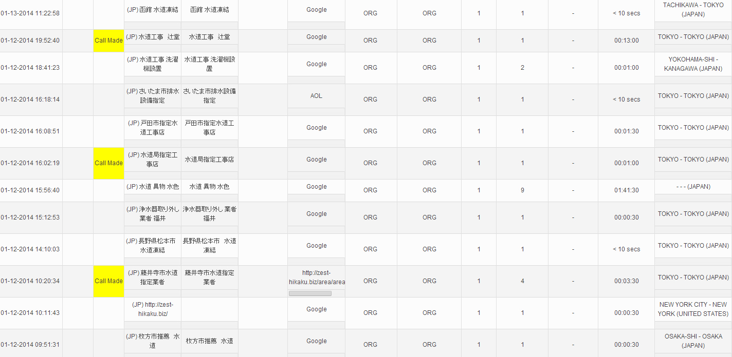 サイト内のランディングページに来訪したページビューやユニークユーザー数はもちろん、訪問者がどこからやって来ているのか、サイト内でどのような経路をたどったのかといった基本的な情報のみならず、ネットビジネスの効率化に必要な様々なデータが得られます。例えば、ユーザーがサイトに来訪し電話した際に、どんなキーワードで検索したのか・どの媒体から来たのか、また、コンバージョンに結びついているキーワードは何かを知ることができます。そのデータは、キーワード別に、架電日時、架電回数、発信者番号、通話時間、通話回数など、細かく把握することができます。