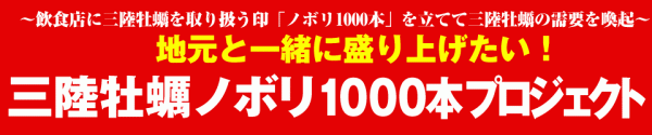 この度、宮城県内の主要地区にある飲食店や小売店のうち三陸牡蠣を取り扱っている店舗に三陸牡蠣をアピールするプロジェクトの共通ノボリを無償で提供し、1000本を目標にそのノボリを県内の至る所で掲げ、地域をあげて三陸牡蠣をPRすることで観光客や地元の人々に対して三陸牡蠣の存在感を高め、震災で落ち込んだ牡蠣の需要を呼び戻すプロジェクト(名称:三陸牡蠣ノボリ1000本プロジェクト)を立ち上げることになりましたので、ご案内申し上げます。