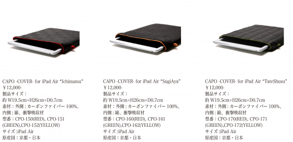 「CAPO -COVER- for iPad Air」を12月17日より販売開始いたします。CAPOは京都・西陣織の技術によって生み出された最先端のカーボン素材の西陣織ケースです。 航空機にも使用されているカーボンファイバーは、軽くて強い繊維として注目をあびています。CAPOはそんな最先端素材をモバイルケースに採用する事で、軽量化、耐久性、耐摩耗性を実現しました。西陣織による市松、杉綾、縦朱子、の3タイプの織柄は、繊維の艶やかさを上品に表現し、独特の光沢感は iPad Airとも相性抜群です。毎日の衝撃にも耐えるクッションを内蔵したケースの縁取りには、同じく西陣の「金襴」を採用し、全体的なシックな色合いの中に、さり気ないオシャレを演出しています。 CAPOの各シリーズは、SleeveCaseJPオンラインショップおよび取り扱い各店舗にてご購入いただけます。京都の奥深い伝統技術と最先端素材がタブレットを力強く包みこむ。そんな繊維と技術が織り成す、西陣織の新しい魅力をご提案します。