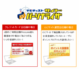 【サイト・パーソナライザ】は、会員向けのWebページなどにおいて、ユーザ行動履歴に合わせたバナーが表示できるサービスです。例えば、クレジットカードの利用金額が多いユーザだけにリボ払いを勧めたり、ECサイトで商品購入はしているが会員登録をしていないユーザにポイントプログラムを訴求するバナーを表示させたりすることができます。