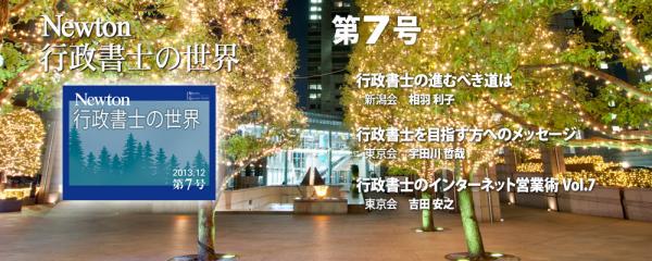 株式会社ニュートン(東京都渋谷区代々木2-1-1新宿マインズタワー20F 代表取締役高森圭介)は、2013年12月16日、月刊Newton「行政書士の世界」(WEB版)第7号を公開しました。幅広い行政書士業務の広報・普及活動による行政書士業務の拡大を目的としています。(URL)http://gyousei-world.newton-jp.com/(お問い合わせ先)03-5352-7760(株)ニュートン支配人大久保宏明 <okubo@newton-net.co.jp>