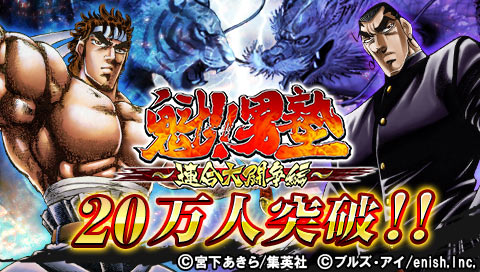 株式会社enish(本社:東京都渋谷区、代表取締役社長:杉山 全功、以下「エニッシュ」)と株式会社ブルズ・アイ(本社:東京都渋谷区、代表取締役社長:上村 豊彦)の提供するネイティブアプリゲーム「魁!!男塾 ~連合大闘争編~」は、おかげさまで20万ダウンロードを突破いたしました。
