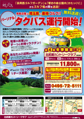 ゴルフ場やホテル・旅館などの運営や運営受託&支援を介し、リゾートの再生と活性化を推進するリゾートソリューション株式会社(略称:リソル、東京都新宿区、多賀道正社長)では、お客様のご自宅近くの発着場所から運行する往復送迎バスとゴルフプレーがセットになったゴルフ企画を実施しておりますが、このほどその冬季限定パーソナル版として好評をいただいております雪の新潟から関東のゴルフ場「北武蔵カントリークラブ」(埼玉県)へ無料送迎するゴルフプラン(今年で3回目)を今シーズンも1月~2月の全4往復で運行予定(下記)しております。
