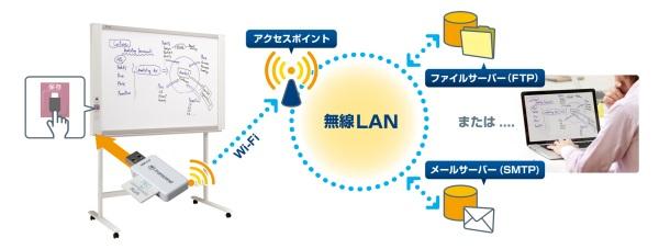 PLUSコピーボード専用「Wi-Fi転送キット」は、専用Wi-Fiカード(Flucard(R) Pro)を使用し、あらかじめ設定したメールアドレスやFTPサーバー上の指定フォルダにスキャンした板書データを無線LAN経由で転送するキットです。