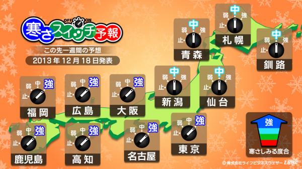 『寒さスイッチ予報』とは・・・この先一週間は寒く感じるのかどうか、一日の気温だけではなく、風や湿度、前日や平年との気温差などを考慮したLBW独自のアルゴリズムをもとに発表している予報