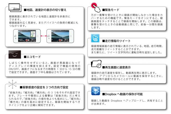 ドライブレコーダーとしての基本機能のほかにも、iPhoneの能力を活かした多彩な機能を搭載しています。3つの画質選択(最高・高・中・低)、ツイッターのタイムライン表示(録画画面上部に1ツイートずつテロップ表示)、静止画撮影(録画中にカメラボタンを押すと写真を撮影)、簡易ナビ機能(現在地から目的までの経路を地図に表示)などを搭載し、基本機能による安全や安心はもちろん、これら様々な機能によってドライブに楽しみと利便性を提供します。