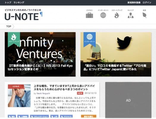 当社が運営するビジネスノウハウまとめサービス「U-NOTE」では、イベントでの成功秘話やプレゼン・営業などの秘訣、明日から役立つ仕事術など、雑誌やニュースでは手に入らない情報を提供しております。現在20~30代の若手ビジネスパーソンを中心に利用され、媒体規模は毎月140%以上の成長を続けております。