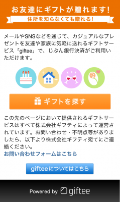 これは、同アプリ内でgifteeが取り扱っているスモールギフト商品をFacebookやTwitter、メールを通じて贈ることを可能にしたものです。じぶん銀行のお客さま向けにカスタマイズされたギフトサービスを画面ごと、じぶん銀行アプリに提供したため、短期間での導入が可能になりました。