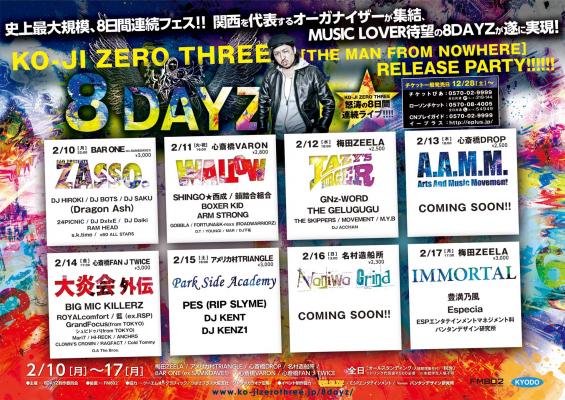 『KO-JI ZERO THREE [THE MAN FROM NOWHERE] リリースパーティー! 8DAYZ』は、2014年2月10日(月)~17日(月)の8日間、大阪市内8箇所で行われる、KO-JI ZERO THREEのリリースライブイベントです。関西のストリートシーンで、絶大な影響力を誇るKO-JI ZERO THREEの2014年2月に3年ぶりの両A面シングル「THE MAN FROM NOWHERE」のリリースにあわせて、関西を代表するオーガナイザーが集い、8日間連続となるリリースライブイベントを行います。