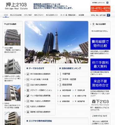「押上2103」は、スカイツリーの足下に広がる押上地域に特化した賃貸情報サイトで、現在開発が進み今後も発展が期待される押上地域の魅力を伝え、多くの方に押上を利用していただくためにリリースされました。地域に特化することで、その地域の情報をより深く提供できるようになります。サイト制作にあたっては、短期間で広告費をかけずにweb集客できることを優先し、SEOに強いサイト設計と、自由にコンテンツ作成ができる「タウン360°」を導入しました。