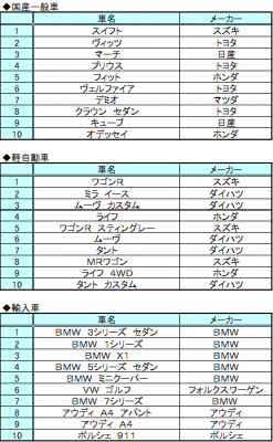 輸入車部門では、BMWが1位から5位を独占、安定した強い人気が続いています。