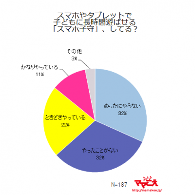 今回「ママこえ(http://mamakoe.jp/)」では、「スマホやタブレットで子どもに長時間遊ばせる『スマホ子守』、してる?」(n=187)とママたちに聞いたところ、「めったにやらない」(32%)と「やったことがない」(32%)という回答が大半でした。一方で、「かなりやっている」という回答も1割に達しており、子育てのためにスマートフォンに頼っているママも一定数いることがわかりました。