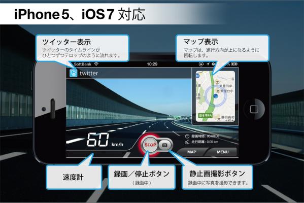 ドライブレコーダーとしての基本機能のほかにも、iPhoneの能力を活かした多彩な機能を搭載しています。3つの画質選択(最高・高・中・低)、ツイッターのタイムライン表示(録画画面上部に1ツイートずつテロップ表示)、静止画撮影(録画中にカメラボタンを押すと写真を撮影)、簡易ナビ機能(現在地から目的までの経路を地図に表示)などを搭載し、基本機能による安全や安心はもちろん、これら様々な機能によってドライブに楽しみと利便性を提供します。