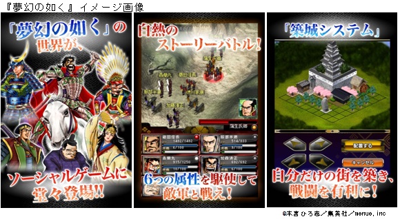 国内最大級マンガ配信サービス『まんが王国』(http://k-manga.jp/)を中核に、コンテンツプラットフォーム事業を展開するmenue株式会社(本社:東京都千代田区/代表取締役社長:吉田仁平)は、2013年12月26日より、「スーパージャンプ(集英社刊)」に連載された人気歴史マンガ「夢幻の如く」をテーマにしたソーシャルゲーム『夢幻の如く』をGoogle Playにて配信開始いたしました。