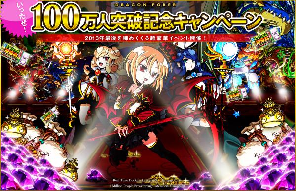 リアルタイム合体カードバトル「ドラゴンポーカー」はこの度、登録ユーザー数が100万人を突破いたしました。日頃からお楽しみいただいている皆様には、心より御礼申し上げます。