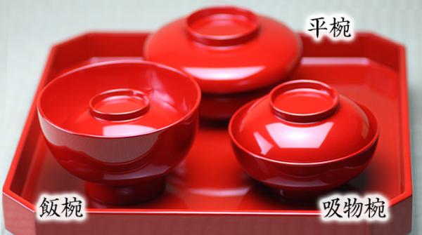 飯椀はお赤飯に、吸物椀は蛤汁などに、平椀はお頭芋や煮合物に使用します。