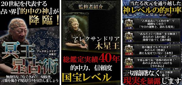 日本にタロットを広めた占術界の神格「アレクサンドリア木星王」。20世紀、最も当たると称され、40年以上にわたり研究・実占を積み重ねてきた本格西洋占星術とタロットを主軸に鑑定を行います。本占いは訪れる“運命の分かれ目”を明確に予見する事を可能とし、人生の変動に大きな影響を与えるとされる“冥王星”に着目した木星王独自の鑑定法で展開されます。これにより、運命のあらゆる局面と、細部にわたる人間の感情・精神変化を洗いざらい浮き彫りにし、不安の根源となる要素を一つ一つ排除していく事ができるのです。20世紀で一番当たるとの呼び声が高い、プロも頼る本物の鑑定をお楽しみください。