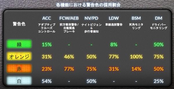 上の図で示されるように OEM は ADAS に様々な配色を採用しており、なかには警告色に緑を採用しているOEM もあり、さらに異なる機能を示すのに同じ色を採用している OEM もあります。例えばマツダはADAS のある機能のシステム異常を検知した場合にはオレンジ色が点滅しますが、ADAS の警告(例、衝突の危険)にもオレンジ色の点滅が採用されています。