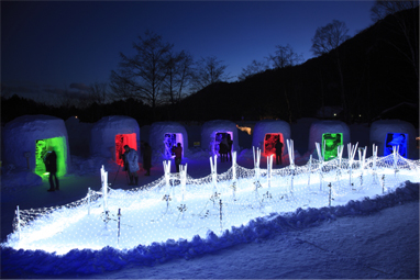 音楽に合わせながら、かまくら&氷彫刻群が光り輝く仕掛けとなります。