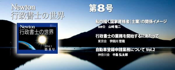 第8号のコンテンツは、(1)私の描く国家資格者(士業)の関係イメージ=立体的共存共栄による国民サポートの輪(2)行政書士の業務を開始するにあたって(3)自動車登録申請業務について Vol.2(4)行政書士と運送関連業務について Vol.1(5)海外取引 Vol.7(6)入国管理今昔 Vol.7~上陸許可基準は、在留資格の変更の基準?~(7)ライフエンディングステージのトラブル予防 Vol.5(8)結婚契約書のすすめ Vol.8結婚契約書は相手の幸せを願って書くラブレター(9)行政書士のインターネット営業術 Vol.8(10)風俗営業許可業務のすべて Vol.8(11)産業廃棄物について Vol.5~こんなに厳しい!産業廃棄物に関する罰則!!~(12)建設業許可申請業務のあれやこれや Vol.8(13)行政書士のNEW分野!行政書士が『知的資産経営支援』に取り組む Vol.8~中小企業支援の専門家として~(14)行政書士会 支部だより-東京都行政書士会 世田谷支部 研修会におじゃましました。(15)「交通事故実務研究会/研修会」におじゃましました。(16)活躍する行政書士に聞きました!(17)法教育への取組み(18)企画委員会のもよう