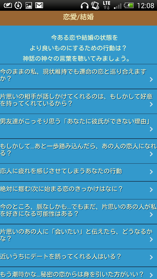 今日/今週/今月の運勢・恋愛運・仕事運・勉強運 / あなたの本当の性格 / あなたの恋愛傾向 / 今、私に想いを寄せている異性はいる? / あなたの迷い、悩みへの神々からのメッセージ 等