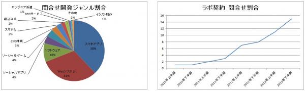 下記は、2013年のオフショア開発ポータルサイト『オフショア開発.com』へのお問い合わせの各開発ジャンル別集計と、問合せ企業の業種割合を示したグラフとなっております。