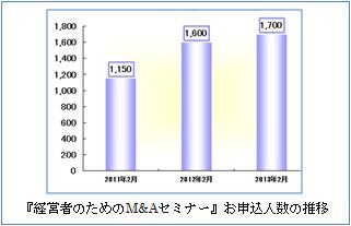 こうした状況を受け、中堅・中小企業のM&Aは年々増加しており、仲介を手がける当社の支援件数は過去最高です。また定期的に開催している当セミナーの参加者は年々増加しており、2013年10月・11月に開催しました同セミナー時には1,800名のお申し込みを頂きました。