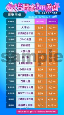 2014年2月5日(水)13時 第1回さくら開花予想発表(予想地点は東北北部から九州)。以降は、毎週水曜日13時に発表。2014年2月26日(水)からは北海道を含めた全国の予想を発表。