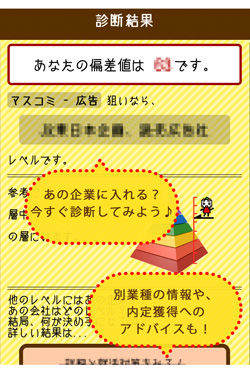 国内最大級のデータベースを持ち、大学生向け就職活動支援サービス「会社なび(http://sk.kaisyanavi.jp/)」を提供する株式会社エスキュービズム(本社:東京都港区、代表取締役社長:薮崎 敬祐、 http://s-cubism.jp/ 以下 エスキュービズム)は、本日2013年1月17日(金)から、iPhone・iPadおよびアンドロイド端末向けに、学生の就職活動における内定確率を偏差値として表すアプリケーション「就活偏差値診断」を無料にて提供開始しました。