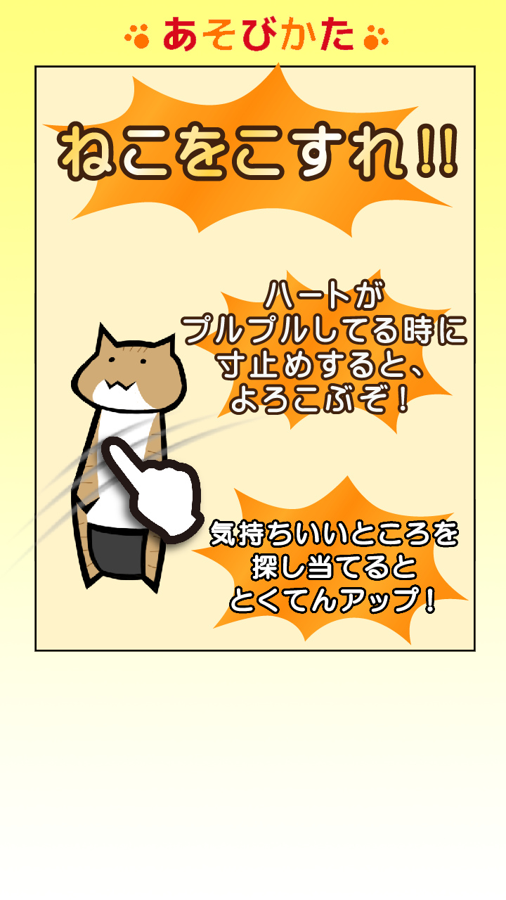 ゲームのルールはシンプル。ねこをこするだけ! ハートがプルプルしている時に「寸止め」すると、ねこがよろこぶぞ! 気持ちいいところを重点的に攻めると、なにかといいぞ! 連続して気持ちよくさせると、意味不明なことを言うぞ! あと、5回COMBOを決めると飽きるし、5回痛くすると怒るしで、気をつけろ!