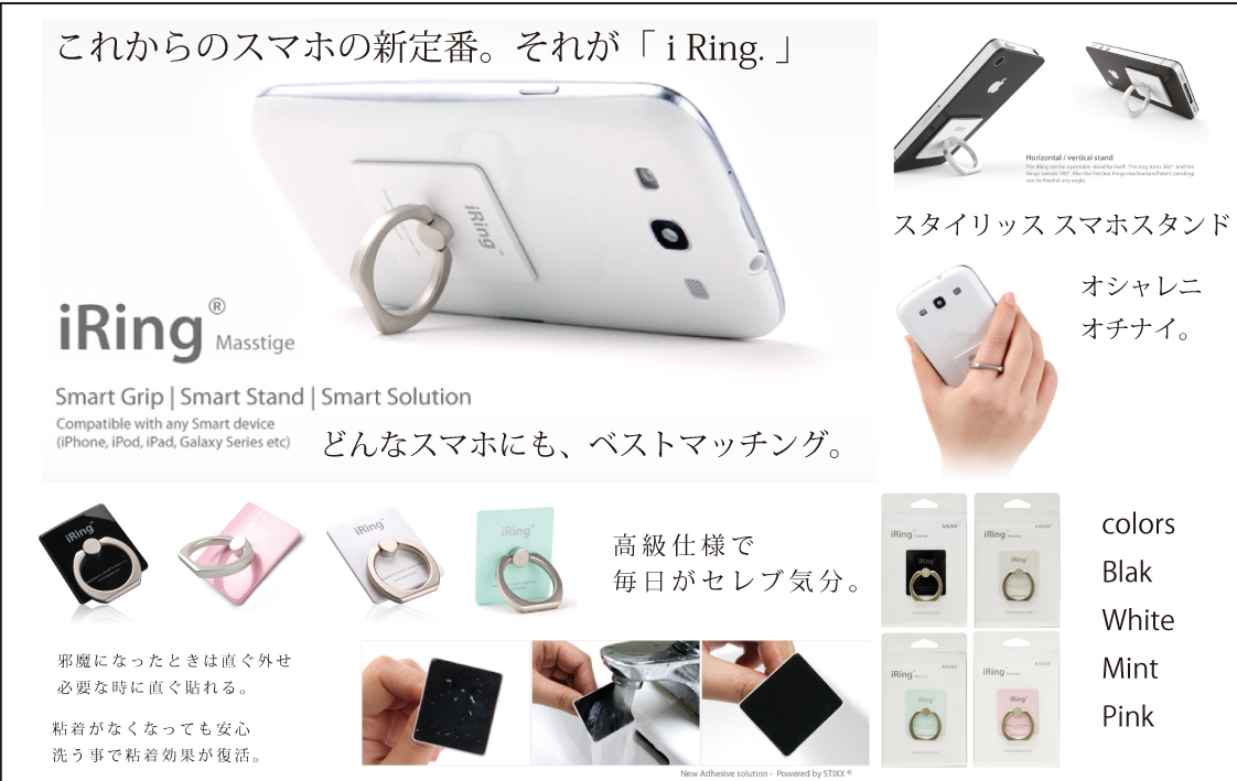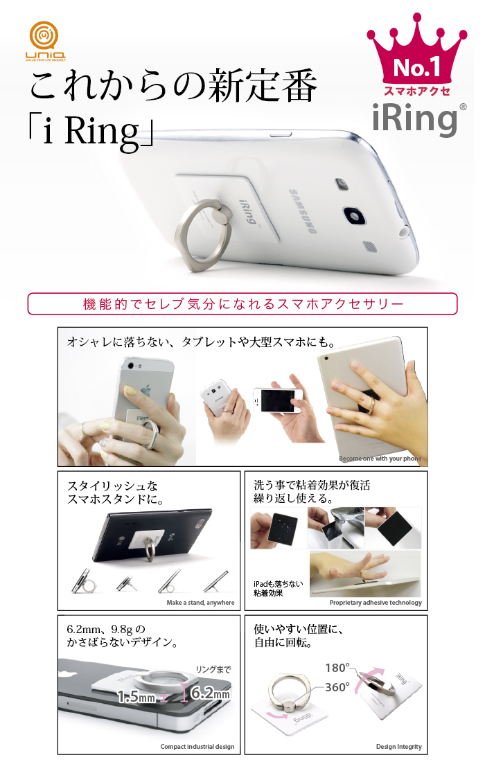 スマートでおしゃれな i-Ring は、大型スマートフォンに取り付ける事により落下を防止ができる。