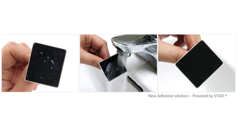 本体接着部は特殊な材質を使用することにより一度つけても簡単に取り外しが可能、接着が弱まった場合でも水洗いすることで接着が戻り、繰り返し使用できるので、必要な時にだけでも取り付けOK。