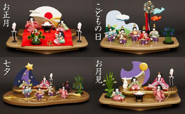 ひな祭りはもちろん、お正月やこどもの日、七夕、お月見の小道具がセットになっていますので、季節に合わせて小道具を変えることで、一年中お人形を楽しむことができます。