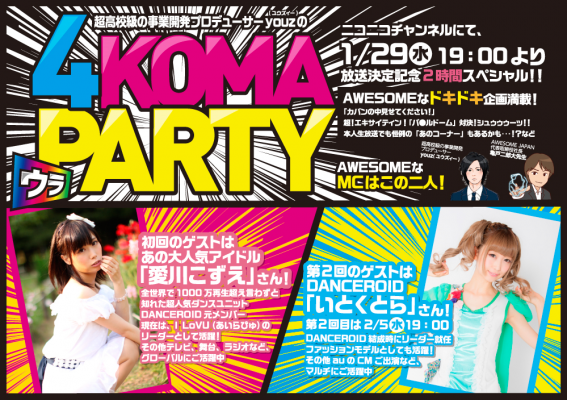 無料で読めるWEB4コマ漫画メディア「4KOMA PARTY(http://4komaparty.com/)」を運営する株式会社AWESOME JAPAN(本社:東京都台東区、代表取締役:金野 太一)は、1月29日より、4KOMA PARTYの魅力をより多くの方々にお伝えするために、ニコニコ生放送にて「超高校級の事業開発プロデューサーYOUZ(ユーズィー)の4KOMA裏PARTY」の放送をスタートします。(初回は1月29日(水)19:00~21:00放送)