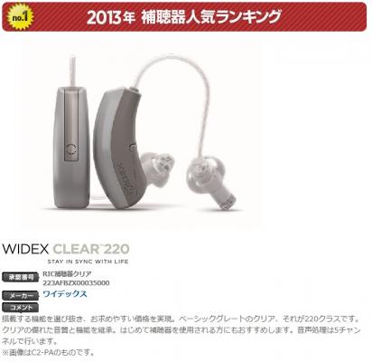 2013年の年間人気ランキングの1位は、ワイデックスのクリア220でした。クリアシリーズは、独自のワイヤレス通信機能を搭載し、テレビや携帯電話の音声を直接補聴器で聞くことができます。テレビや携帯電話との連携によって、クリアシリーズは、毎日の生活における補聴器の可能性を大きく拡げたということができるでしょう。220クラスは、クリアシリーズの中でもお求めやすい価格を実現したシリーズで、そのコストパフォーマンスの高さによって現在でも多くのユーザーの支持を集めています。