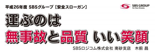 今年度は、昨年を大幅に上回る4500件の応募作品から、SBSロジコム南砂支店の木前社員の作品を最優秀賞に選出。2014年度安全スローガンとして、車両貼付ステッカーや掲示ポスターをグループ全社に配付し、事故撲滅に取り組んでまいります。