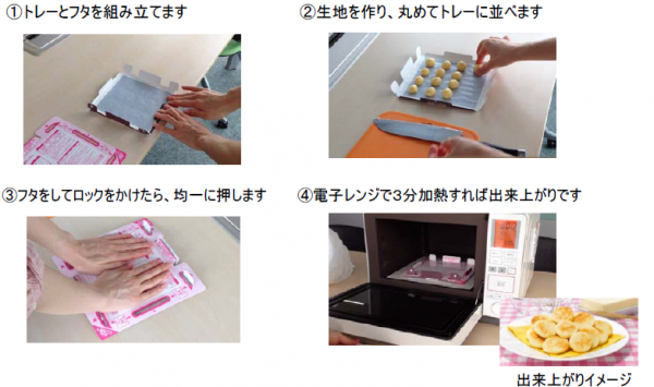 専用トレーに生地をのせて、レンジで3分チンするだけで、美味しいクッキーが焼きあがります。後片付けも簡単で手軽にクッキー作りを楽しんでいただけます。
