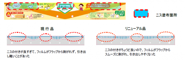 従来品はフラップに直線状にニスが塗布されており、フィルムがフラップに過剰にくっつくことがありましたが、今回のリニューアル品は、ニスをストライプ状に塗布したので、フラップとフィルムがよりスムーズにはがれ、引き出しやすくなりました。