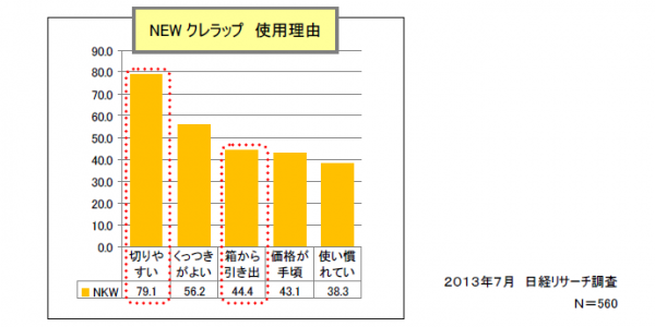 お客様が「NEWクレラップ」を購入する理由を調査したところ、(1)フィルムの切りやすさと(2)箱からの引出しやすさを重視することが判りました。今回のリニューアルでは、重視されている2点を更に強化し、使い勝手の向上を実現しました。
