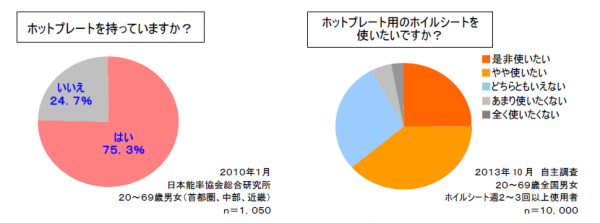外部機関の調査によるとホットプレートの所有率(首都圏、中部、近畿)は大変高く、 また、ホットプレート用のシートがあれば使いたいという意向が強いということが自主調査でわかりました。