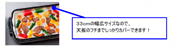 ですが、「ホットプレート用ホイルシート」は更に幅広の33cmです。大きなホットプレートでもフチまでしっかりカ