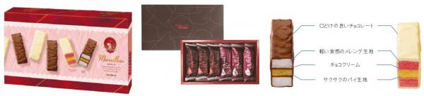 特 徴:「チョコクリーム」「メレンゲ生地」「パイ生地」の3つのバランスの良い食感と口どけのハーモニーをお楽しみいただける商品です。