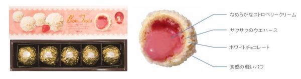 特 徴:丸いウエハースの中になめらかなストロベリークリームを入れ、ホワイトチョコレートと軽い食感のパフでコーティングし、見た目もかわいらしい商品に仕上げました。