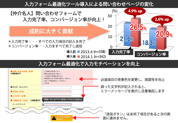 導入前の2013年4月と、導入から約8ヶ月経過した2014年1月に「入力完了率」と「コンバージョン率」のデータを検証したところ、導入前(2013年4月)と現在(2014年1月)で、入力完了率(全導入の平均値)が26.5%(4.9%アップ)、コンバージョン率(全導入数の平均値)は20.9%(2.6%アップ)となり問い合わせが改善され効果が実証されました。