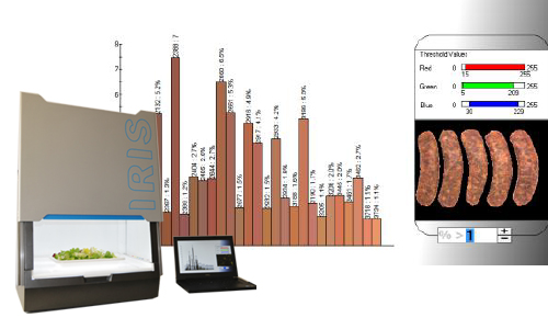 食品の見た目は、消費者の購買意欲を最初に左右する決定要因でもあり、鮮度の指標としても使われます。ビジュアルアナライザー IRIS は、食品などの複雑かつ不均一なサンプル表面の見た目(外観)を数値化するシステムです。サンプルをチャンバー内の高解像度カメラで撮影し、細分割されたサンプル表面の色や大きさのばらつきを、最先端のパターン認識ソフトウェアで迅速かつ高感度に解析します。人が目で見て感じるように、「色・形・大きさ」を数値化できるのが大きな特徴です。