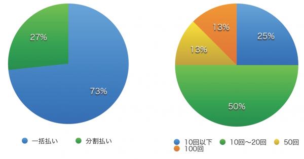 一括払いは7割と高め、最高は1000万円。分割の場合は10~20回が多数。