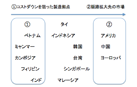 海外進出の目的として、主なものは、「(1)コストダウンを狙った製造拠点」「(2)販路拡大先の市場」の2つが挙げられます。新興国の発展は、以前生産拠点として見られていた中国が市場として見られてくるといったように、(1)から(2)へと推移していきます。2013年度の問い合わせをもとに各国を分類してみると、このような図になります。
