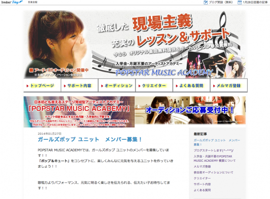 様々なWEBサービス事業を手がける株式会社Placeは、メディアイノベーション合同会社と株式会社Placeで運営している【入学金・月謝不要のPOPSTAR MUSIC ACADEMY】のライブドアブログが音楽(総合)カテゴリにて、2014年1月28日に一位を獲得しました。2014年2月10日現在、一位を継続中です。