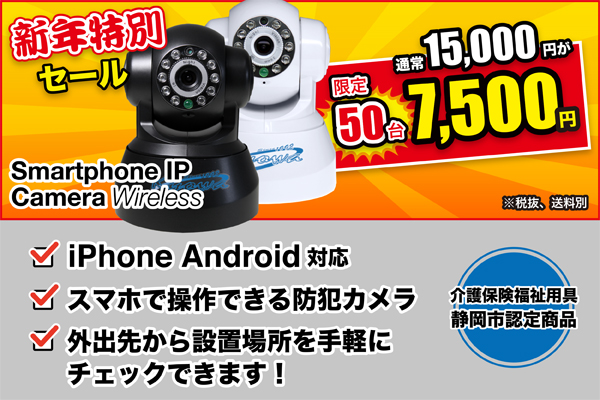 株式会社 恭和(本社:静岡県静岡市、代表:太田則明)は恭和楽天市場店で2011年10月17日から販売中のスマートフォンIPカメラワイヤレスを新年特別セールとして、2014年01月31日(金)から数量50台限定で、通常価格15,000円(税抜き)を特別価格7,500円(税抜き)で販売いたします。